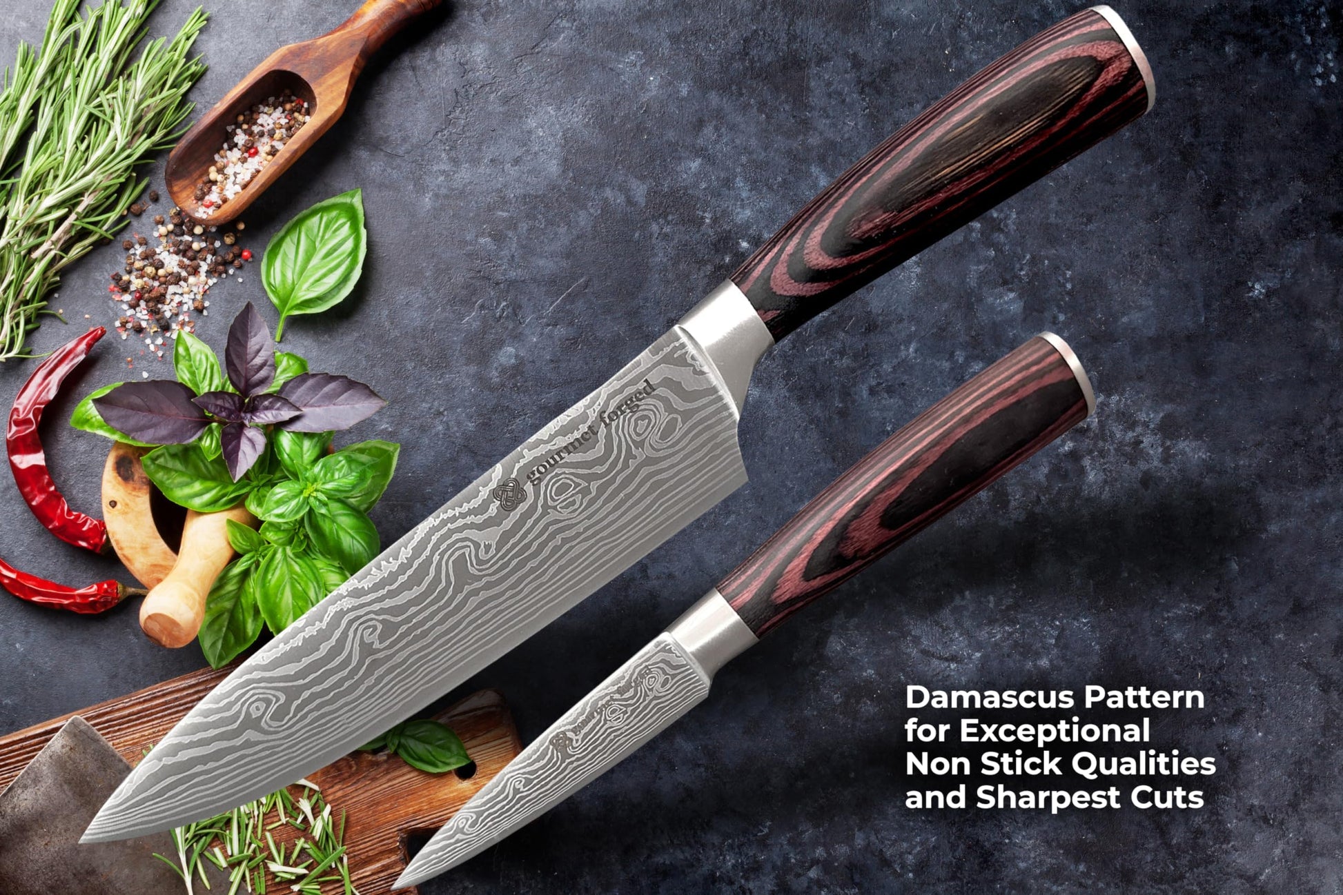 - Chef Knife Set: Exceptional Cutting Performance! Experience the joy of effortless cutting with our high carbon stainless steel knives. The 8 inch chef knife boasts a thickness of 2.5mm and easily cuts even the toughest meats and vegetables, while the 3.5 inch paring knife excels at intricate tasks like peeling and trimming fruits and vegetables. Both knives are rust and dulling resistant.
